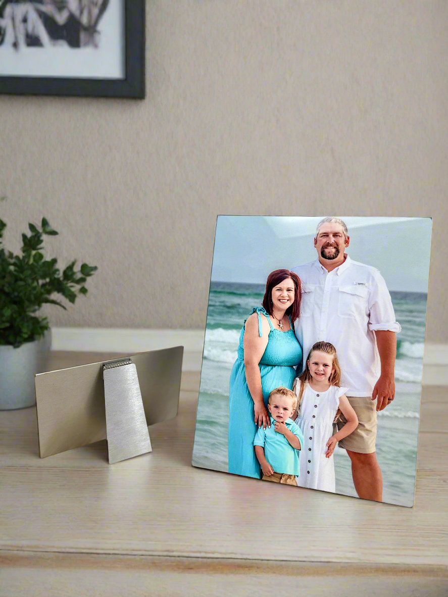 Crafted From Double-Brushed .040” Aluminum, this Easel Offers an Elegant Solution for Displaying Desktop Metal Prints. For Added Versatility, you Can Upgrade to Include an Integrated Top Hanger, Allowing Customers to Effortlessly Showcase Smaller Photos on the Wall as Well.